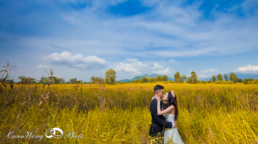 Janice 和 Cyrus的 pre wedding 在三十三度的高温下拍攝, 但天空很蔚藍, 黄昏的天空雲霞亦醉人,其實在香港映的pre wedding 景色一樣可以很美, 並非一定要往海外尋.